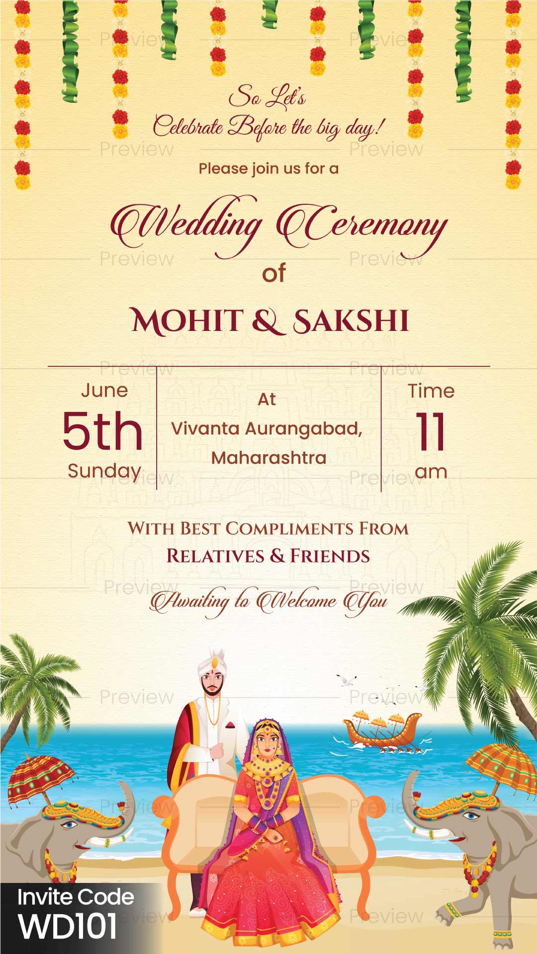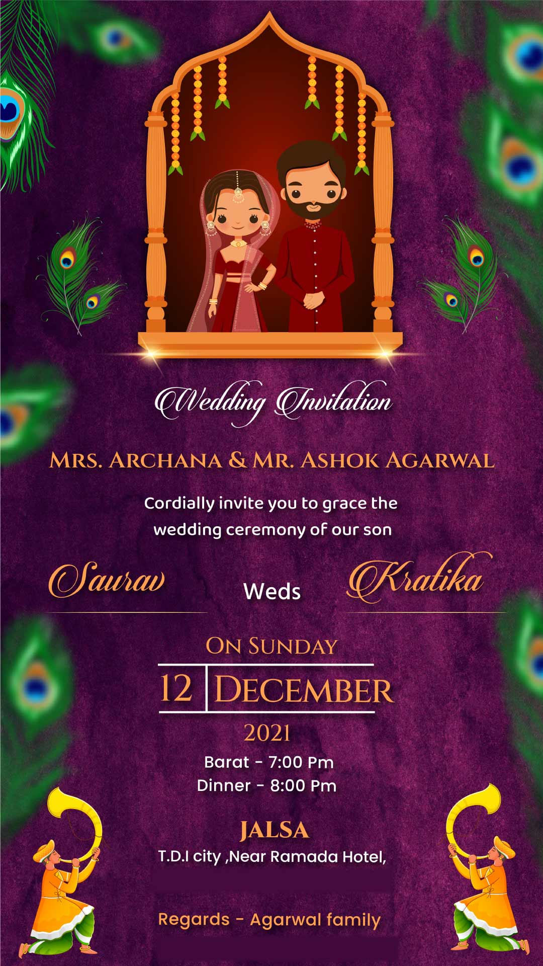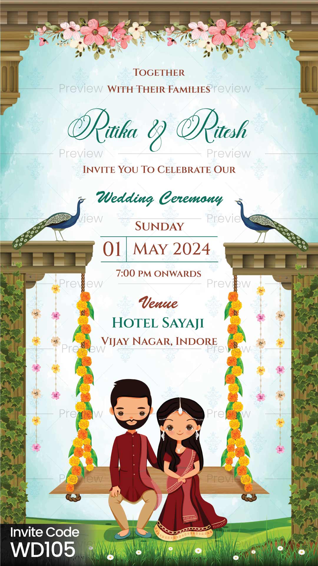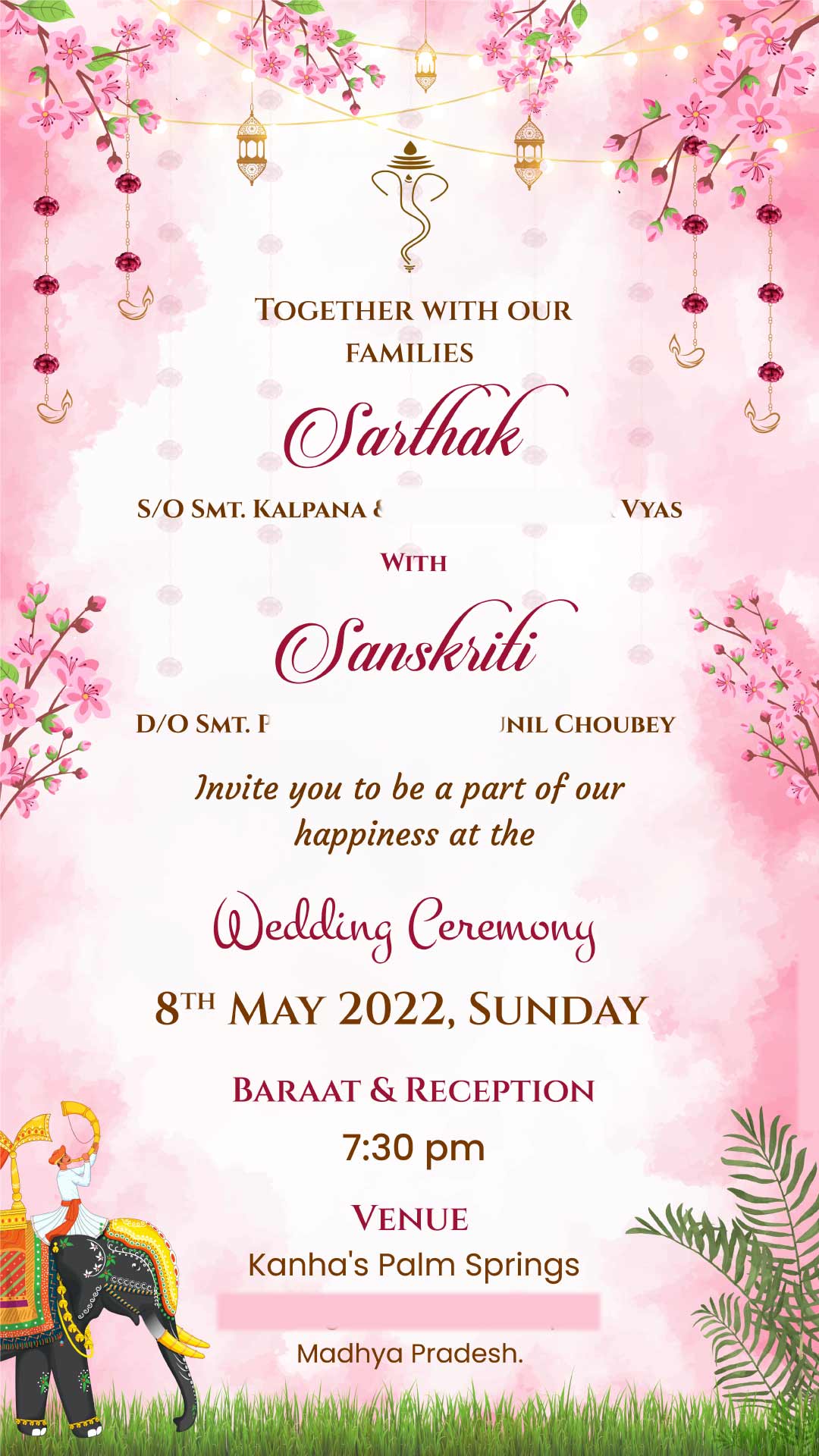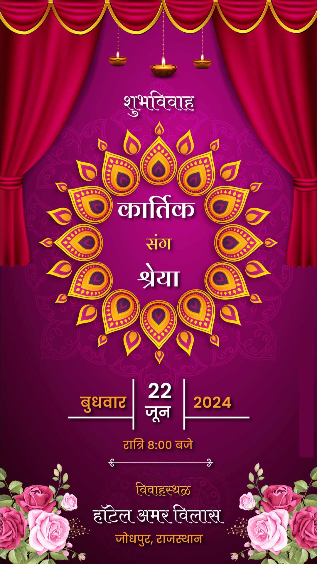 Create Personalized Indian/Hindu Invitation Video, All You Have To Do Is Choose A Card Design Template.And Your Program Details Like Wedding Date, Bride Name, Groom Name, Parents Name, Pre-Wedding Ceremony, Wedding Ceremony, Send Us Information On Whatsapp.