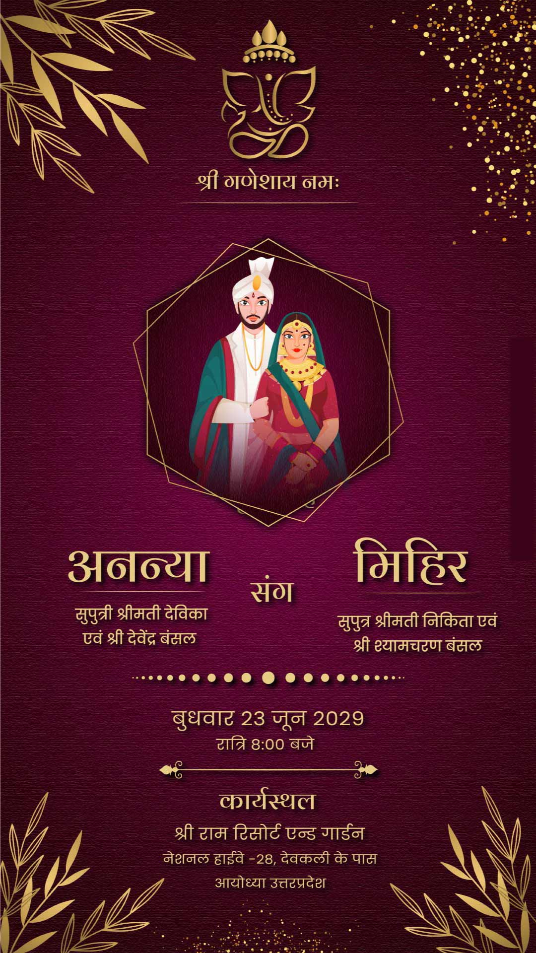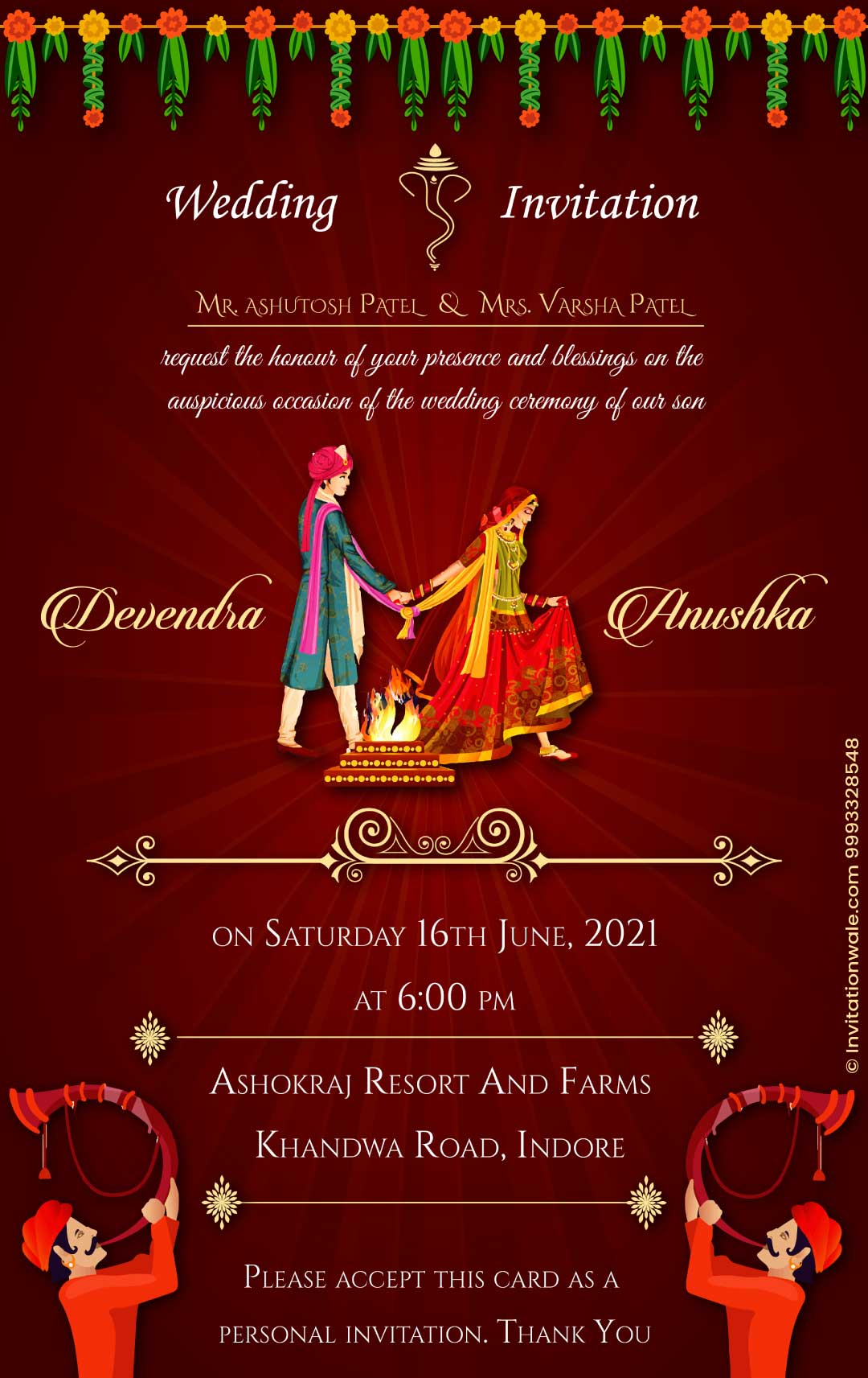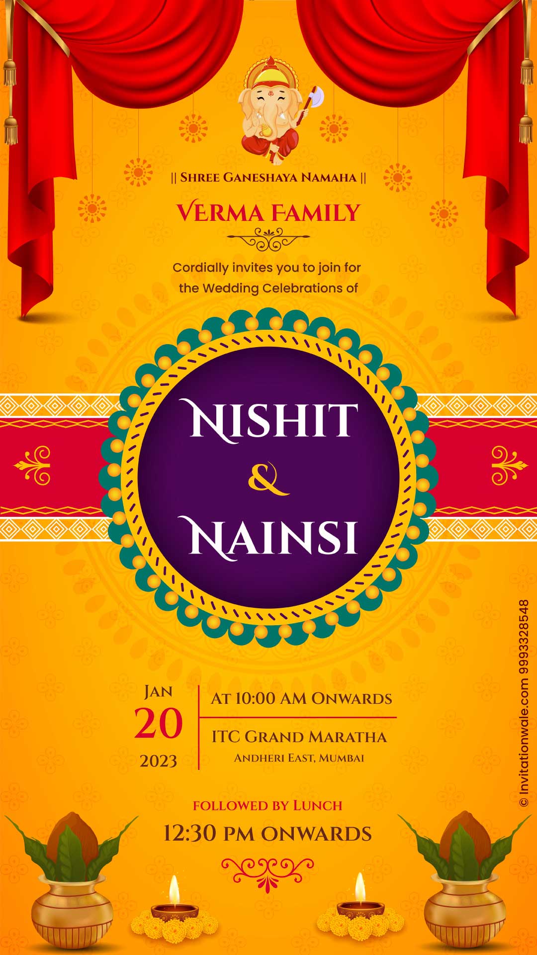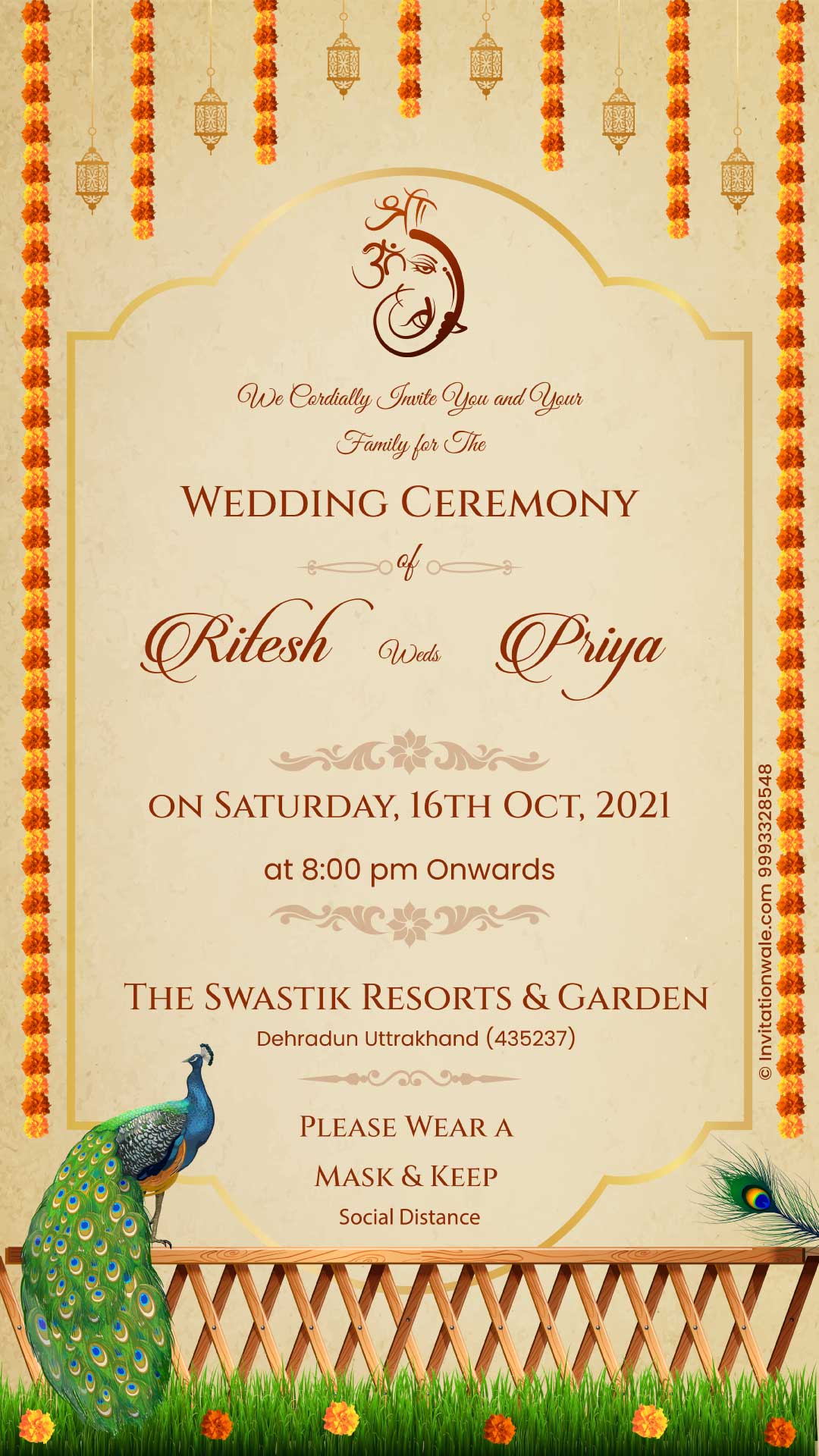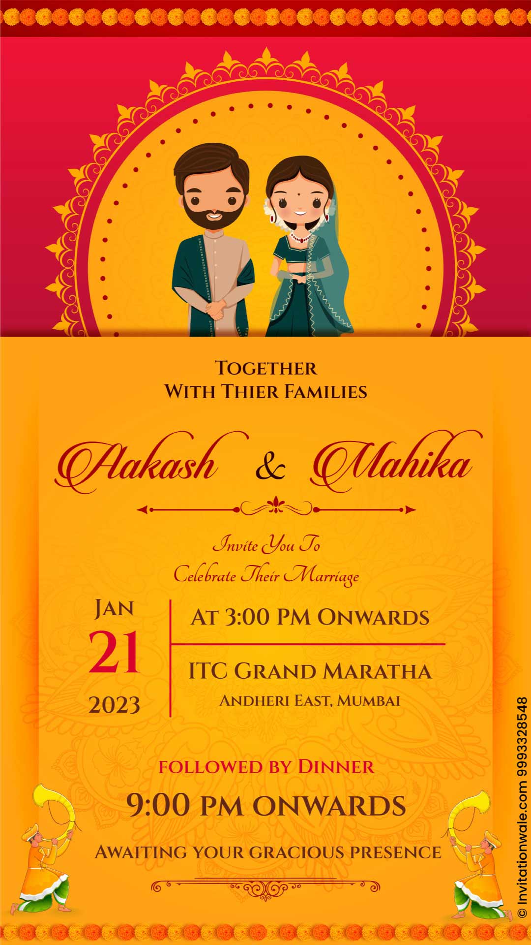 Create Personalized Indian/Hindu Invitation Video, All You Have To Do Is Choose A Card Design Template.And Your Program Details Like Wedding Date, Bride Name, Groom Name, Parents Name, Pre-Wedding Ceremony, Wedding Ceremony, Send Us Information On Whatsapp.