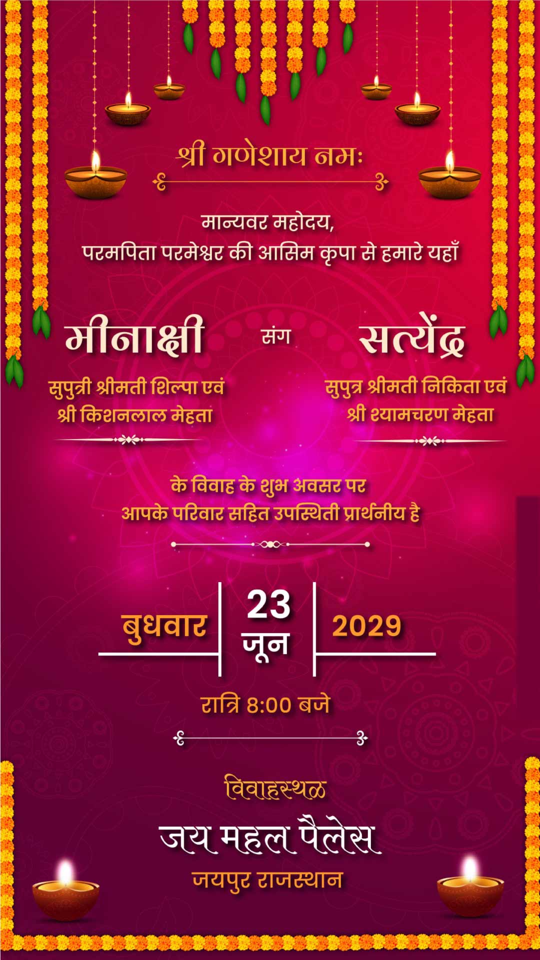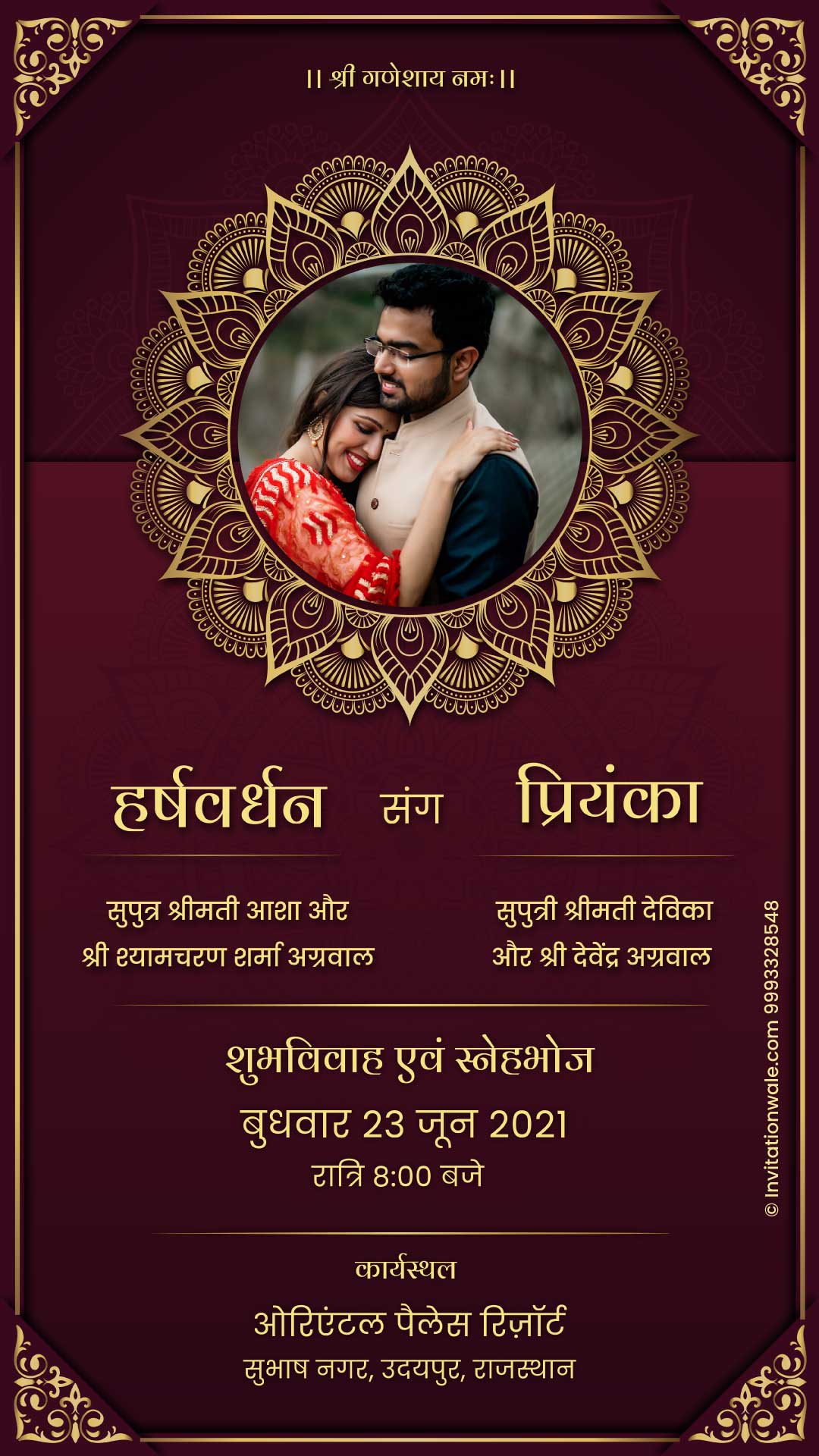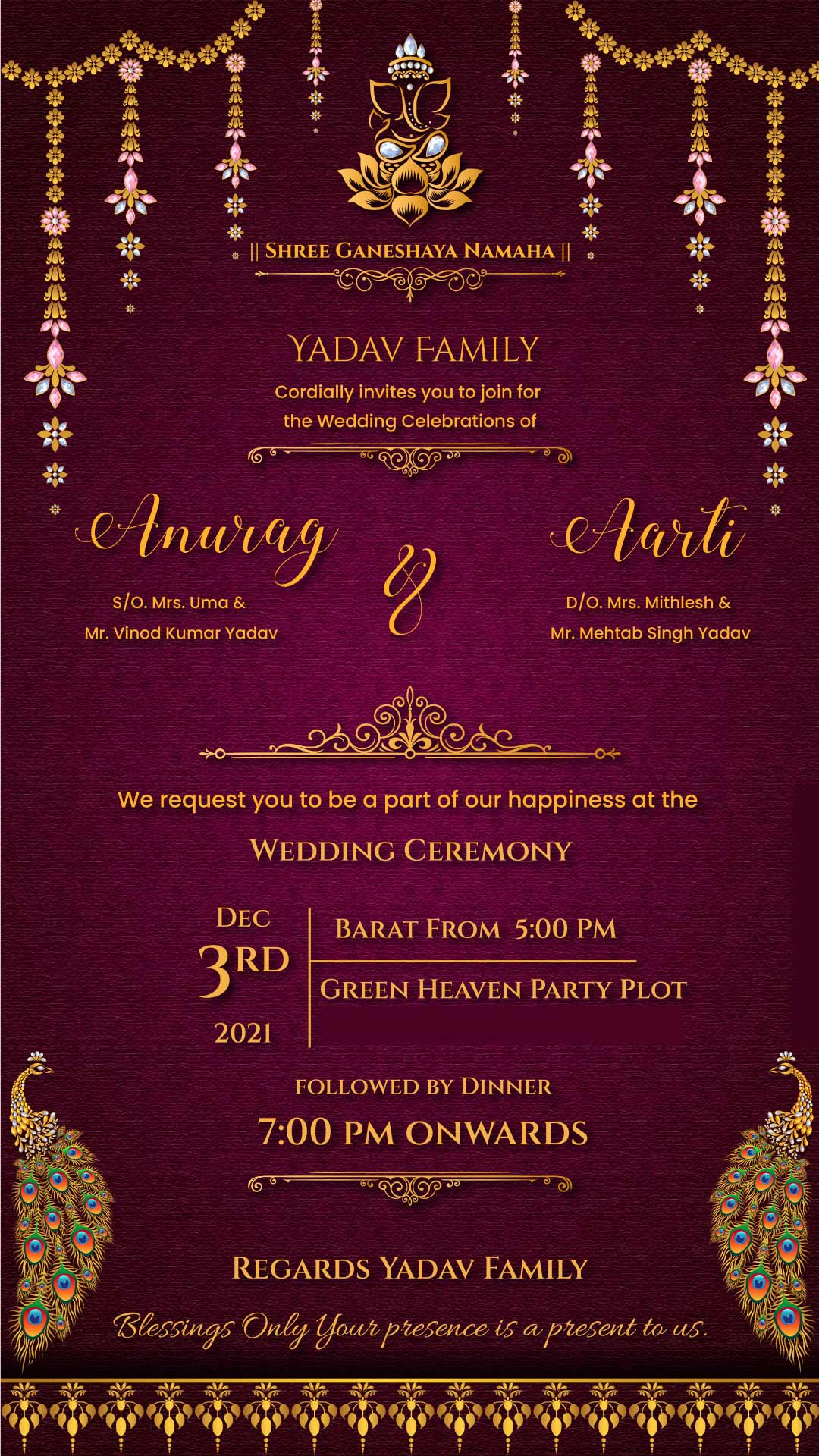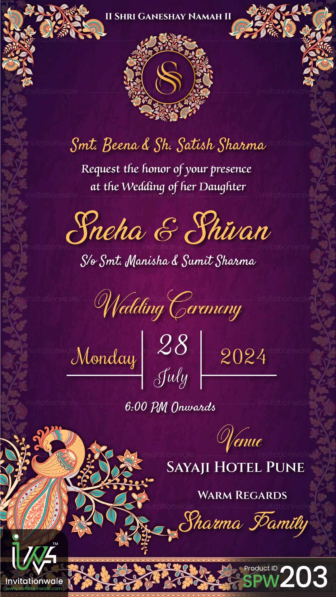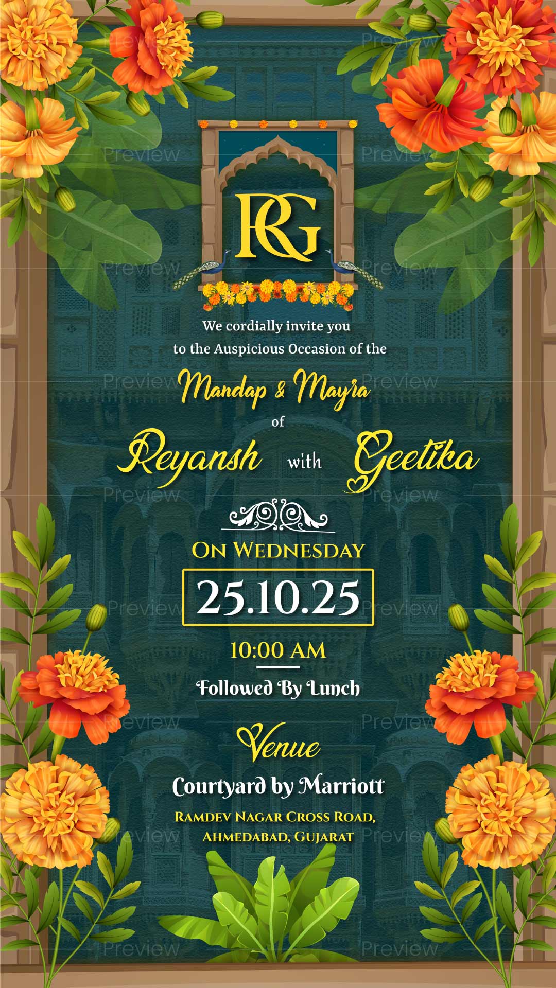 Create Personalized Indian/Hindu Invitation Video, All You Have To Do Is Choose A Card Design Template.And Your Program Details Like Wedding Date, Bride Name, Groom Name, Parents Name, Pre-Wedding Ceremony, Wedding Ceremony, Send Us Information On Whatsapp.