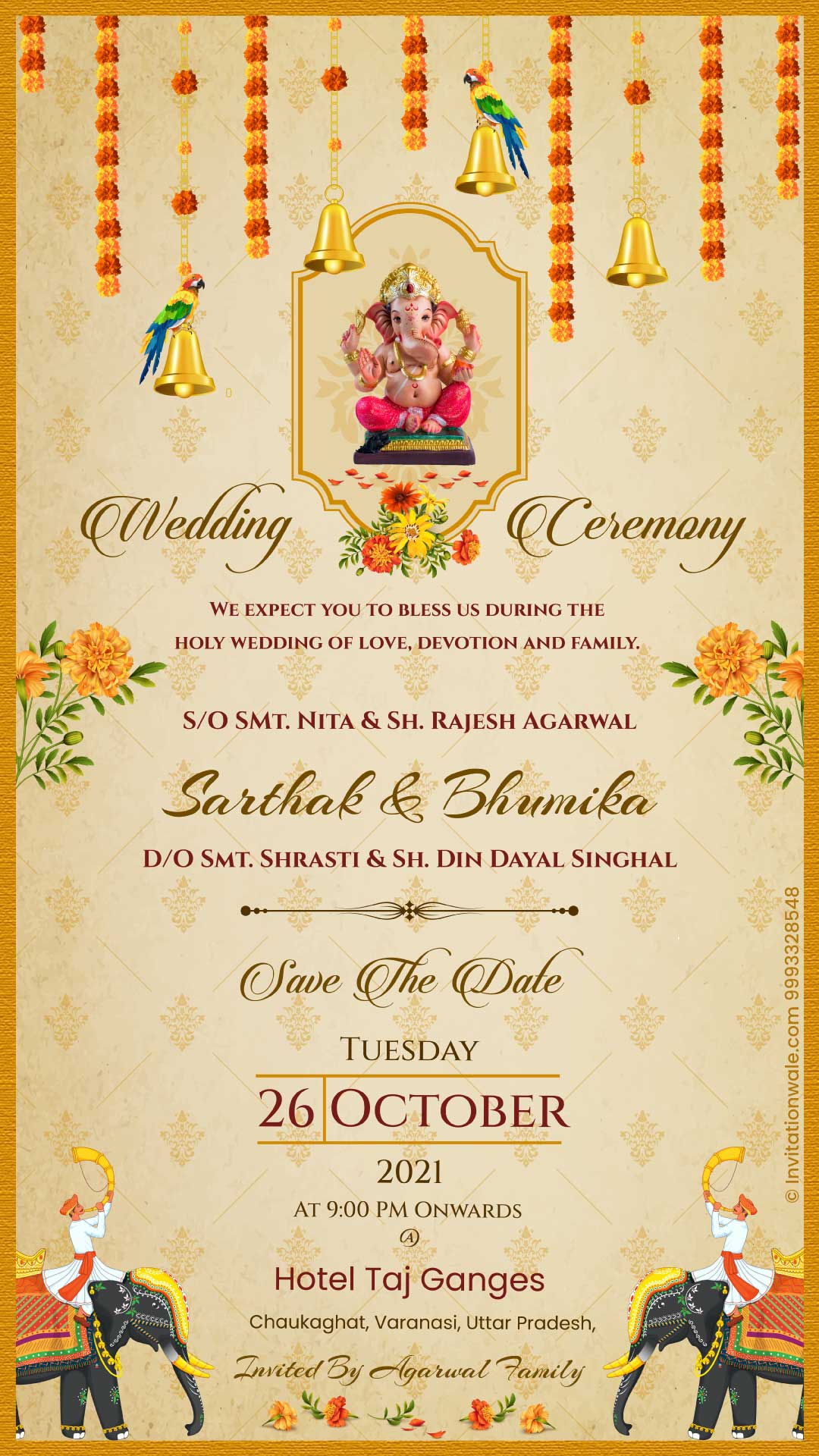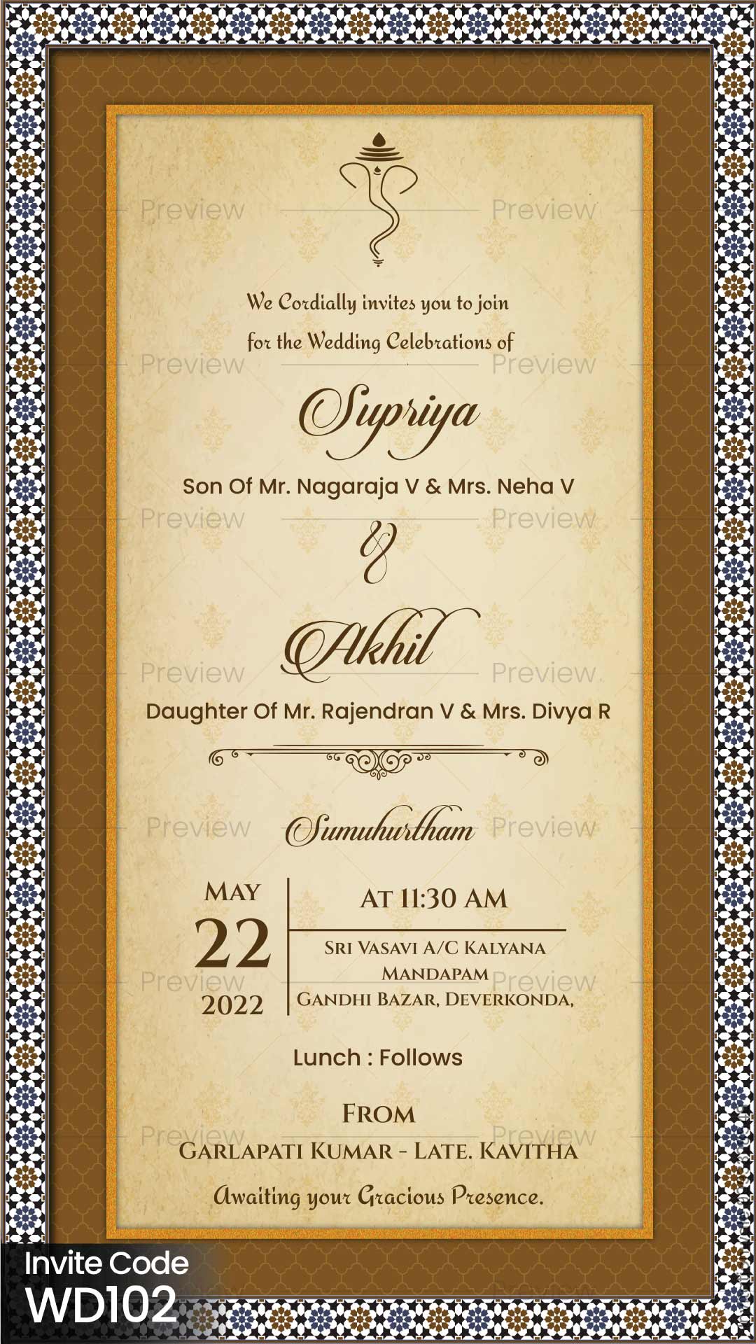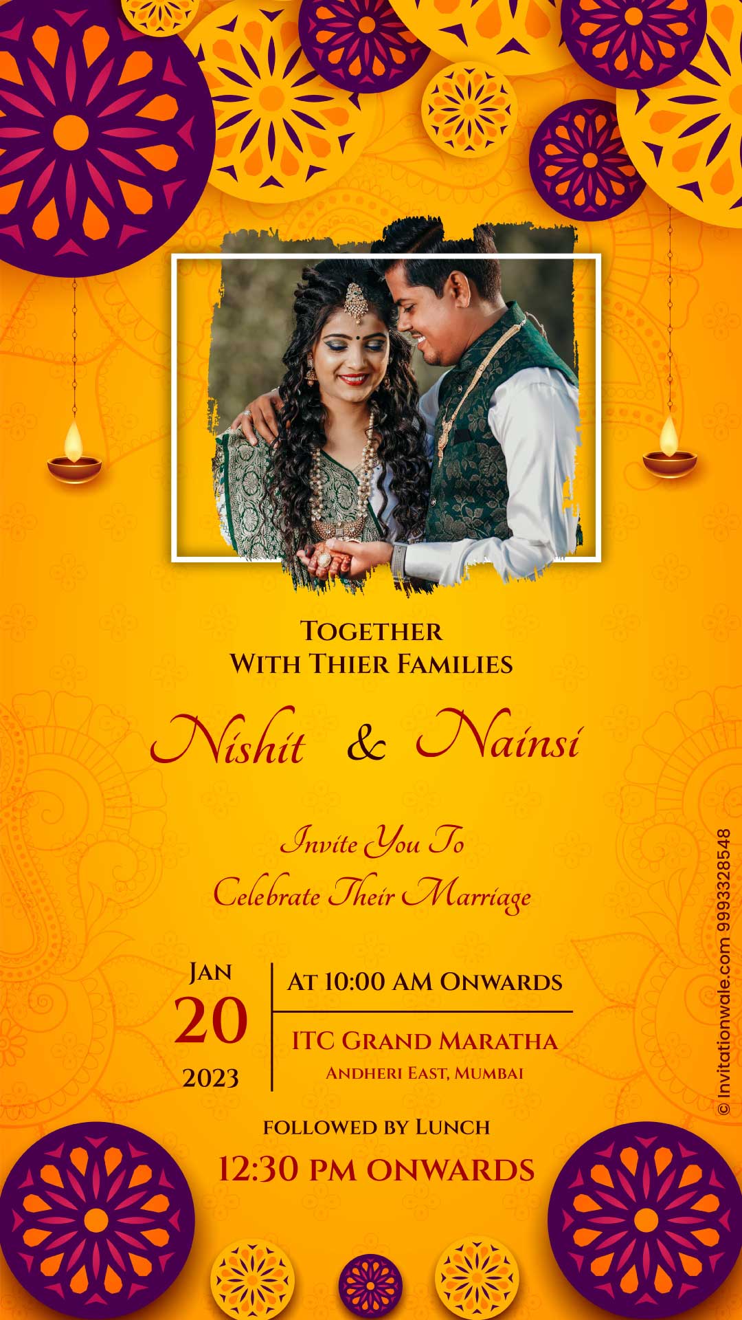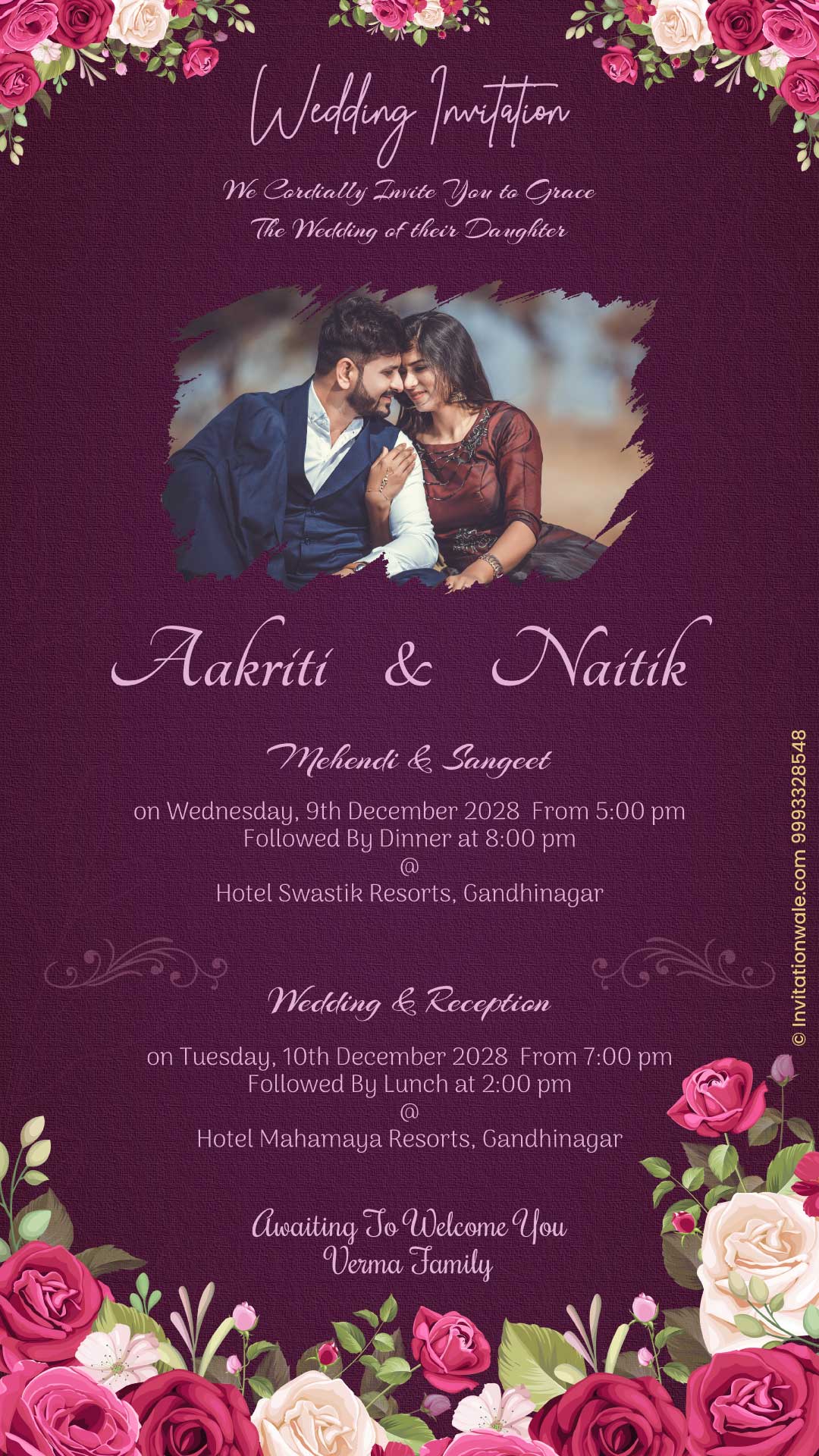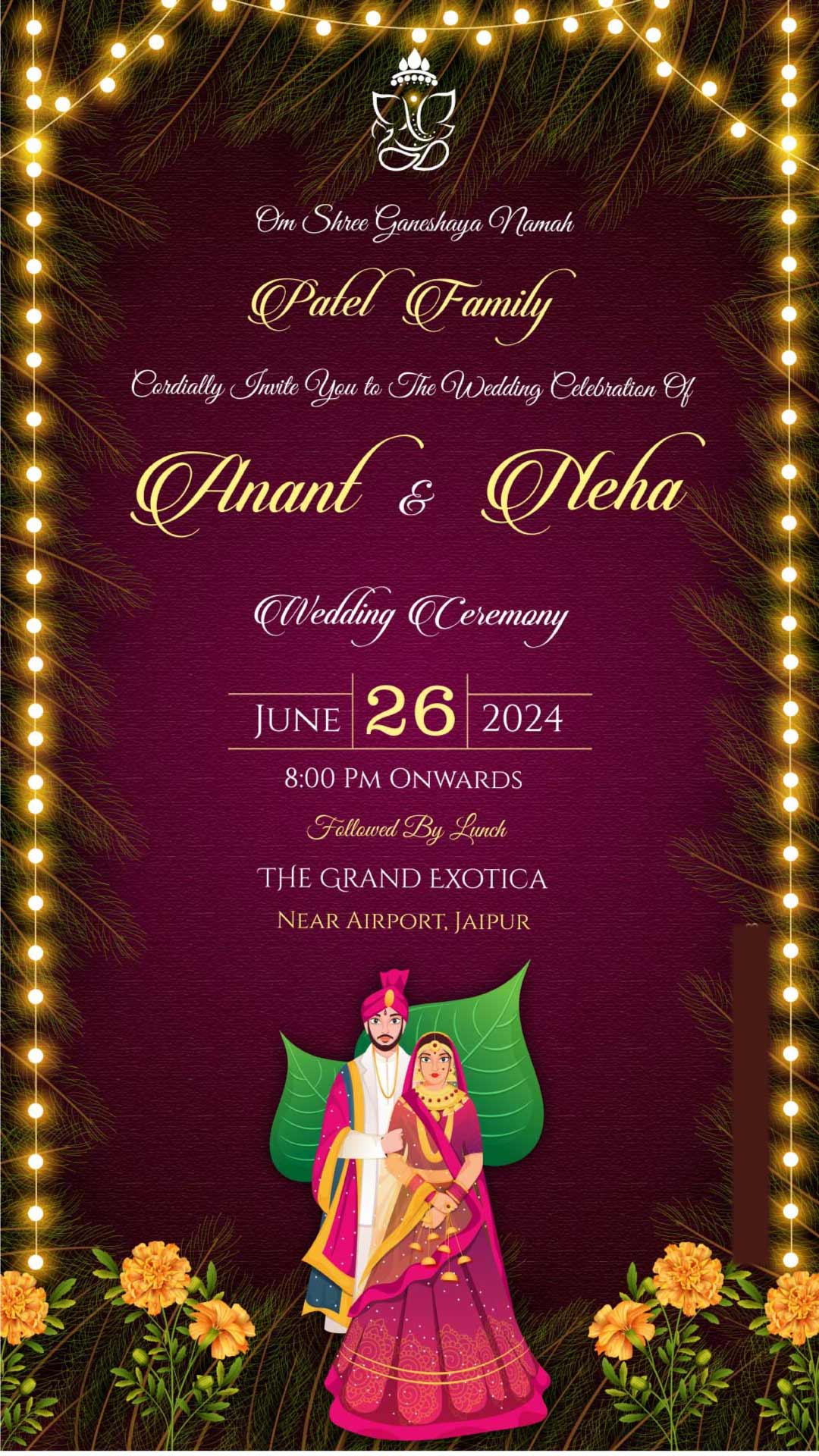 Create Personalized Indian/Hindu Invitation Video, All You Have To Do Is Choose A Card Design Template.And Your Program Details Like Wedding Date, Bride Name, Groom Name, Parents Name, Pre-Wedding Ceremony, Wedding Ceremony, Send Us Information On Whatsapp.